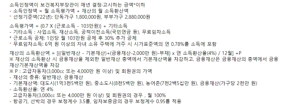 소득인정액은 소득 평가액과 재산의 소득환산액을 합산한 금액으로, 소득은 근로 ․ 사업 ․ 재산 ․ 공적이전소득 등을 반영하고, 재산은 일반재산·금융재산 등을 반영 됩니다.