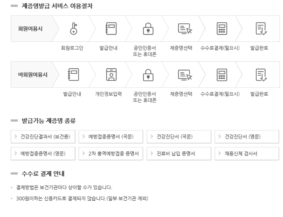 일부 보건소는 온라인에서 원본발급만 출력이 가능하고 재발급을 원하시는 경우네는 직접 방문해서 수수료를 결제해야 하는 경우도 있습니다.