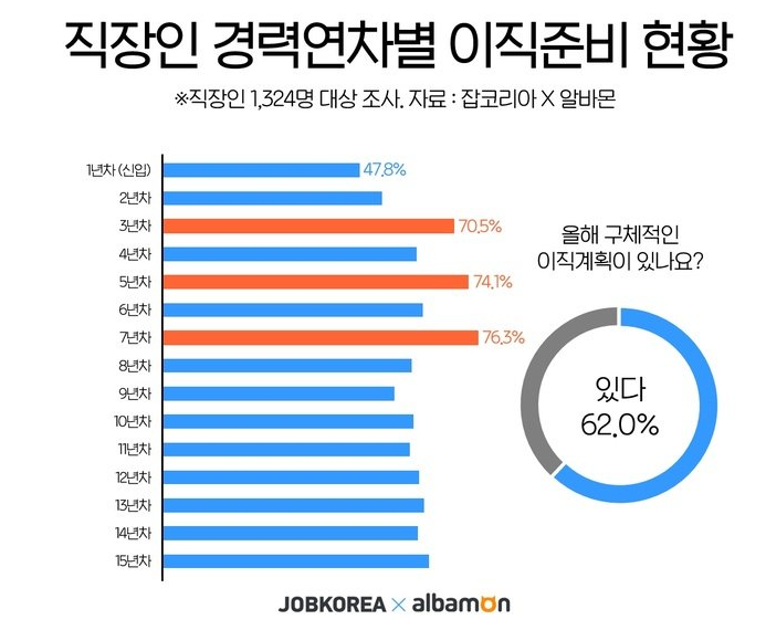 취업 플랫폼 잡코리아가 남녀 직장인 1324명을 대상으로 조사한 결과에 따르면, 직장인 중 62%가 올해 구체적으로 이직할 계획을 가지고 있었다.