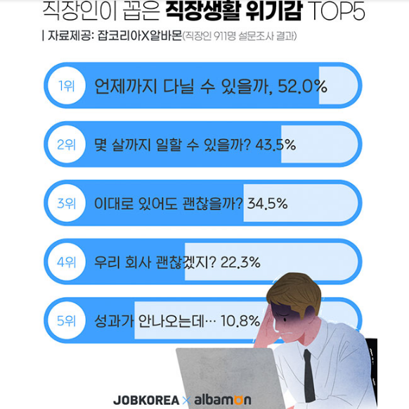 취업 플랫폼 잡코리아가 아르바이트 전문 포털 알바몬과 함께 직장인 911명을 대상으로 ‘직장생활 위기감’을 주제로 설문조사를 실시한 결과 이 같은 결과가 나왔다.