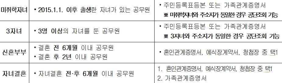 ⦁사회정책적대출(11종) : 미취학자녀, 질병휴직, 신혼부부, 자녀결혼, 노부모부양, 육아휴직,3자녀, 장애인 및 장애인가족, 한부모가족, 공무상요양, 양자입양
