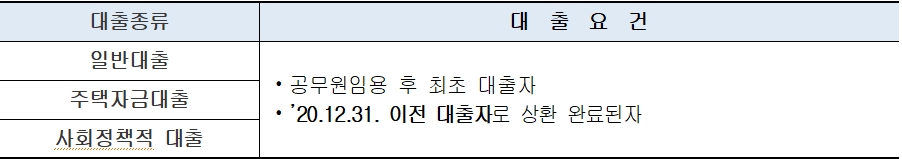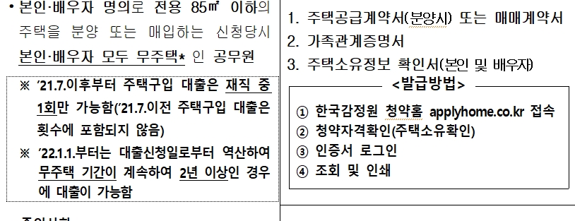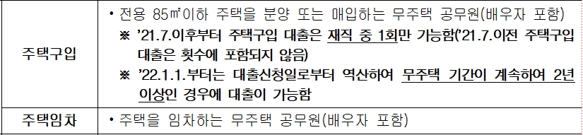 ⦁’21.7.이후부터 주택구입 대출은 재직 중 1회만 가능함(’21.7.이전 주택구입 대출은 횟수에 포함되지 않음)