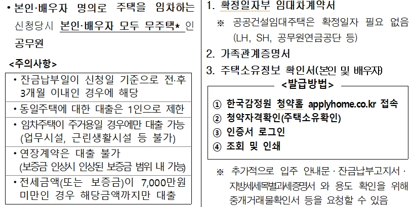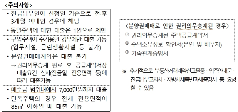 * 무주택 기준은 ‘주택소유정보 확인서’상의 재산세(주택분) 과세 여부 및 부동산 거래내역 등에 따라 판단하며,「주택공급에 관한 규칙」등에 따라 주택소유여부를 판단하지 않음(소액징수면제도 대출 불가)