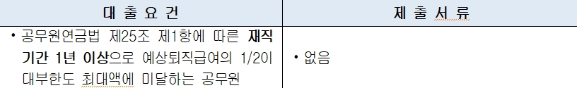 ⦁(단기재직) 공무원연금법 제25조 제1항에 따른 재직기간 1년 이상으로 예상퇴직급여의 1/2이 대출한도 최대액에 미달하는 공무원