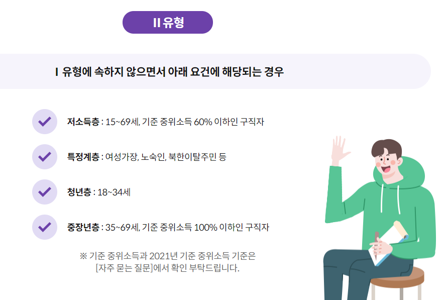 참여자의 소득과 재산 등에 따라 두 가지 유형으로 지원하게 됩니다.