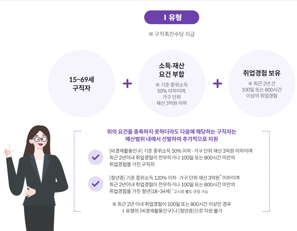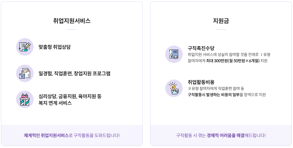 Ⅰ 유형은 ‘구직촉진수당’과 ‘취업지원서비스’를 함께 지원합니다.