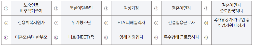 취업을 원하는 청년, 장기실업자, 경력단절여성, 저소득 구직자, 특수형태근로종사자 등 취업취약계층으로