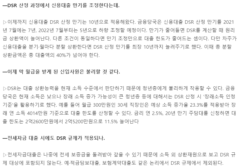7월 1일부터 서울 등 규제지역에서 6억원이 넘는 집에 대해 주택담보대출을 받거나 1억원 이상 신용대출을 받을 때에는 DSR 40%가 적용된다.