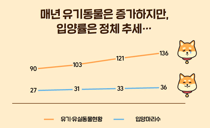 입양문화 확산을 위해 유기동물을 입양하면 입양비를 지원합니다.
