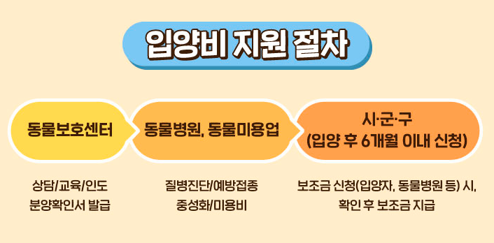 동물보호센터에서 입양확인서를 발급받아 동물등록을 완료한 후 입양비 청구서를 작성하여 동물보호센터 또는 동물보호센터가 있는 해당 시·군·구청에 입양 후 6개월 이내에 신청하면 된다.