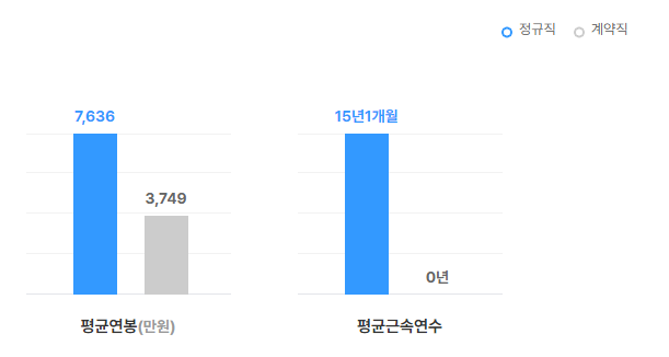 정규직은 연 평균 7,636만원, 계약직은 연 평균 3,749만원입니다.