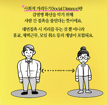 사회적 거리두기란 감염병 확산을 막기 위해 사람 간 접촉을 줄인다는 뜻입니다.