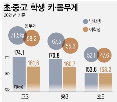 또 중학교 3학년 여학생의 몸무게(55.3㎏)와 고등학교 3학년 남학생 몸무게(71.5㎏)는 2년 전과 견줘 변동이 없었습니다.