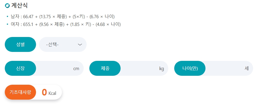 - 여자 : 655.1 + (9.56 × 체중) + (1.85 × 키) - (4.68 × 나이)