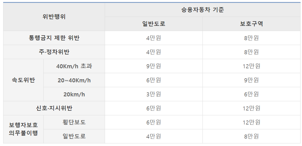 교통약자보호구역인 어린이보호구역, 노인보호구역, 장애인보호구역에서는 법규 위반 시 과태료, 범칙금, 벌점을 기존에 비해 2배로 부과됩니다.