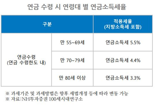 반면 연금소득세는 연령에 따라 차등 적용하지만 3.3~5.5%의 단일세율을 적용합니다.
