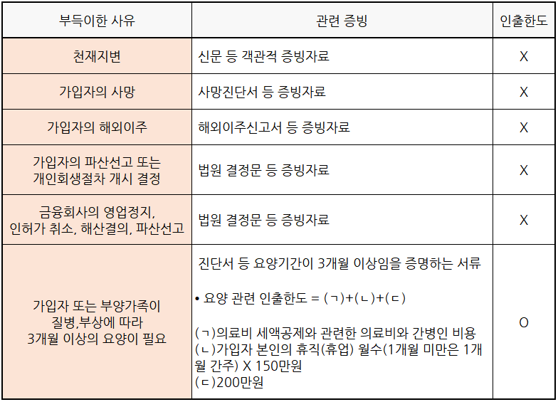 가입자 또는 부양가족의 3개월 이상 요양이 필요한 경우 정해진 3가지 금액의 한도 내에서 인출이 가능 합니다.