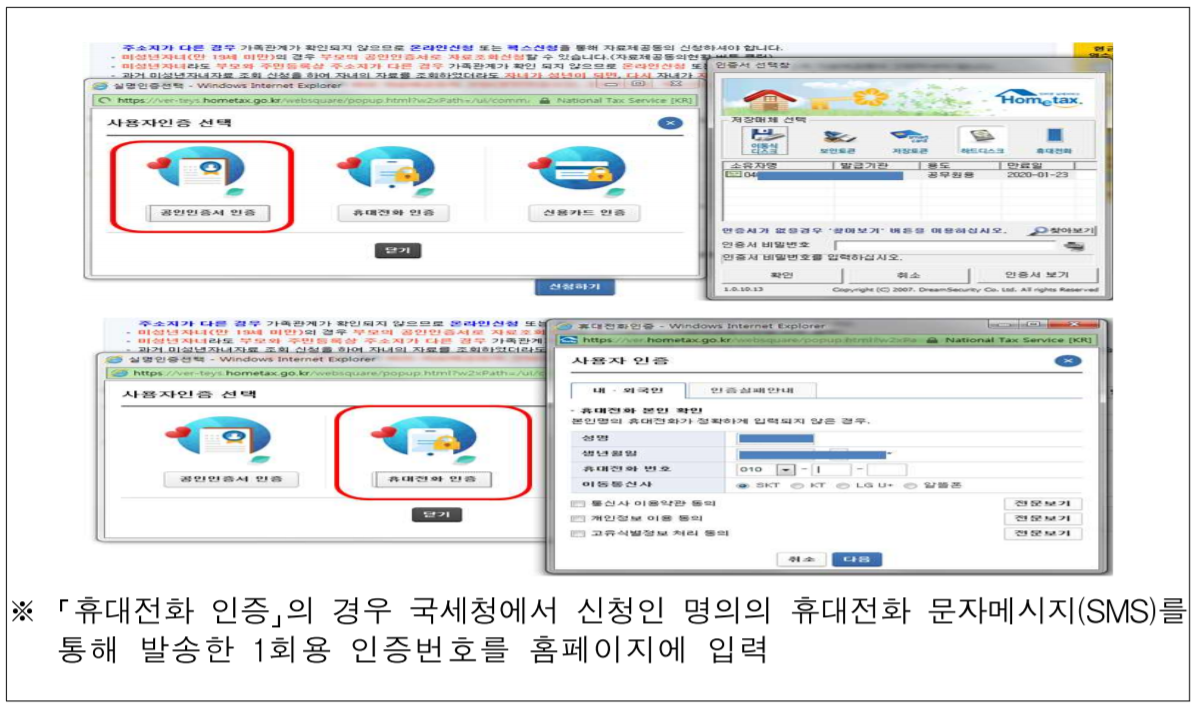 2) 부양가족이 본인 명의의 휴대전화에서 공인인증서, 휴대전화로 인증하여 신청