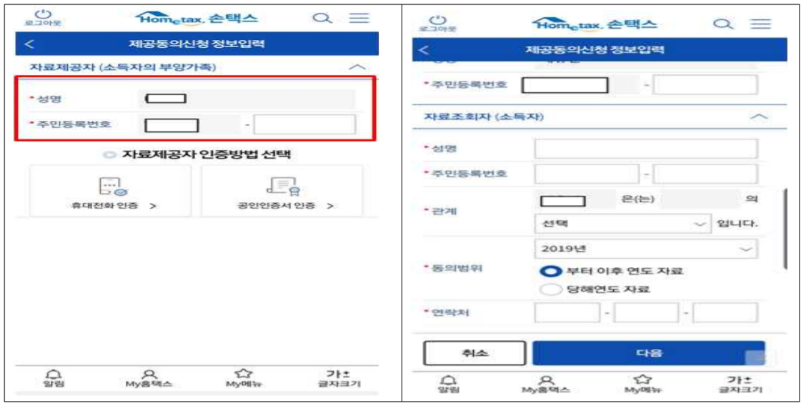 - 모바일에서 자료제공동의는 대리인(근로자) 신청은 불가능하고,자료제공자(부양가족 본인)만 신청이 가능