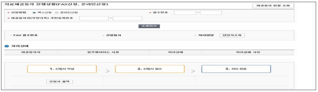※ 팩스가 수신되었으나, 접수번호가 미입력 상태인 경우에도 ‘신청서 작성’으로 조회되며, 접수번호가 입력되면 ‘신청서 접수’로 조회됨
