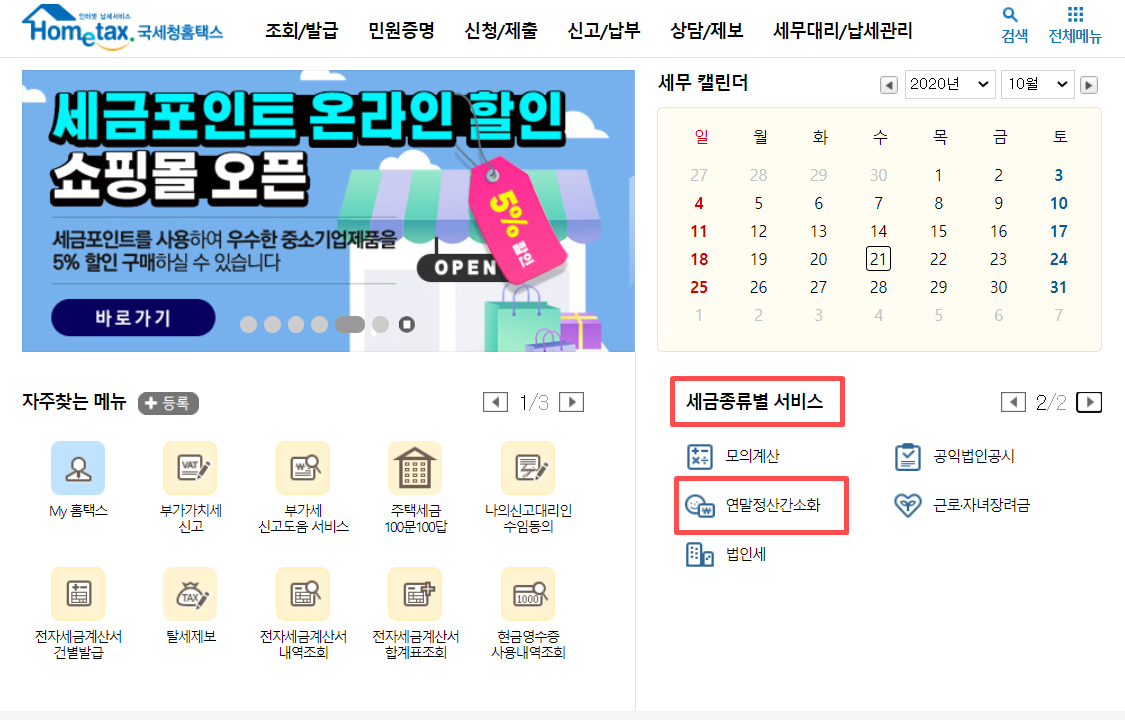 ① 홈택스 초기 화면의 [세금종류별 서비스]에서 연말정산간소화 클릭