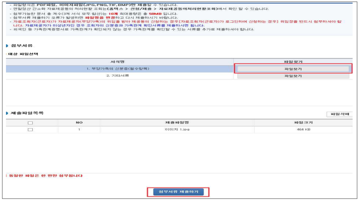 ④ [파일찾기]를 클릭하여 필수 제출서류 업로드 후 첨부서류 제출하기 클릭