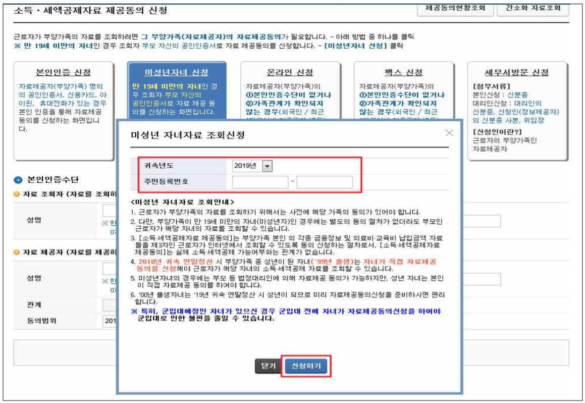 ② 연말정산간소화 화면 [자료제공동의 신청]에서 미성년자녀 신청 클릭