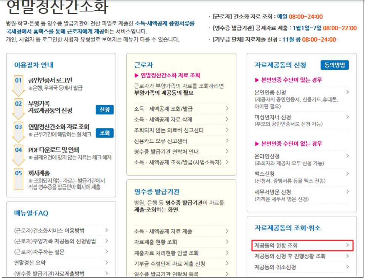 ② 연말정산간소화 화면 [자료제공동의 신청]에서 제공동의 신청 후 진행 상황 조회 클릭