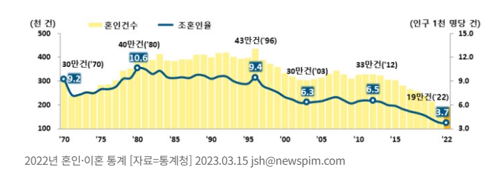 통계청이 최근 내놓은 '2022년 혼인·이혼 통계'에 따르면 작년 혼인 건수는 2021년(19만2500건)보다 0.4% 줄어든 19만1700건으로 나타났다. 관련 통계 작성이 시작된 지난 1970년 이후 가장 적은 수치다.