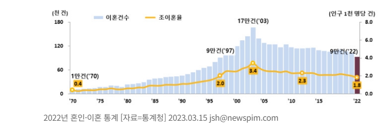 인구 1000명당 이혼 건수를 뜻하는 조이혼율은 1.8건으로 1년 전보다 0.2건 감소했다.