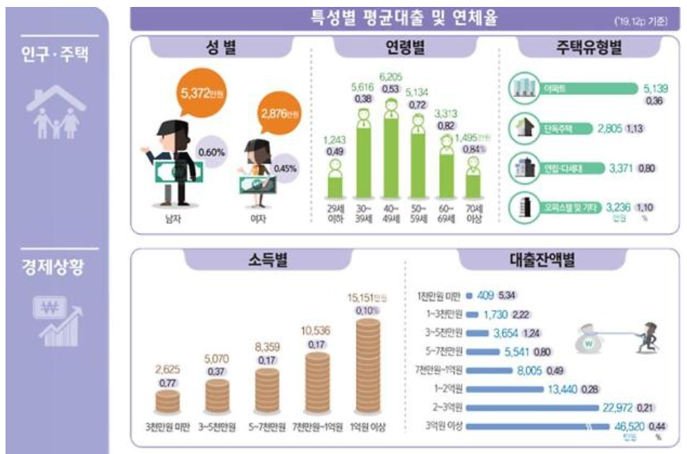 임금근로자 평균대출은 소득이 높을수록 부채 규모 또한 높았으며, 연체율은 소득이 낮을수록 높게 나타났다