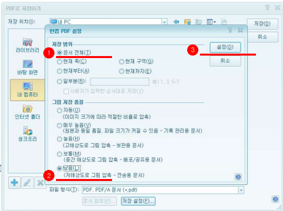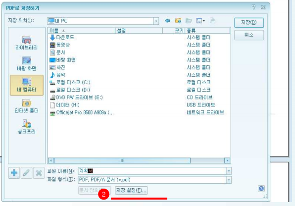 ▶‘PDF로 저장하기 창에서 ‘저장설정’을 클릭하여 설정창을 불러 냅니다.
