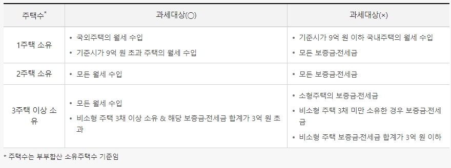 주택임대소득 과세대상은 월세 임대수입이 있는 2주택 이상 소유자와 보증금 등의 합계액이 3억 원을 초과하는 3주택이상 소유자임