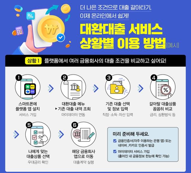 소비자는 은행, 저축은행, 카드·캐피탈사에서 기존에 받은 신용대출 정보를 쉽게 조회해 더 유리한 조건으로 한 번에 갈아탈 수 있다.