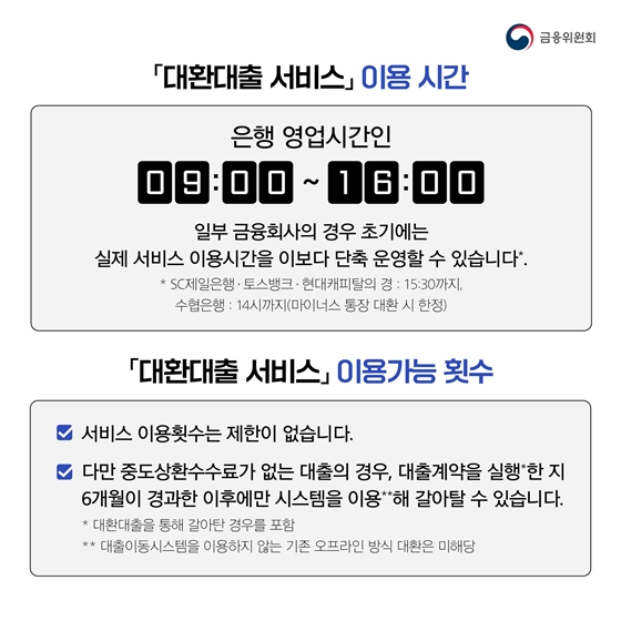 대환대출 서비스 이용 시간은 매 영업일 오전 9시부터 오후 4시까지다.
