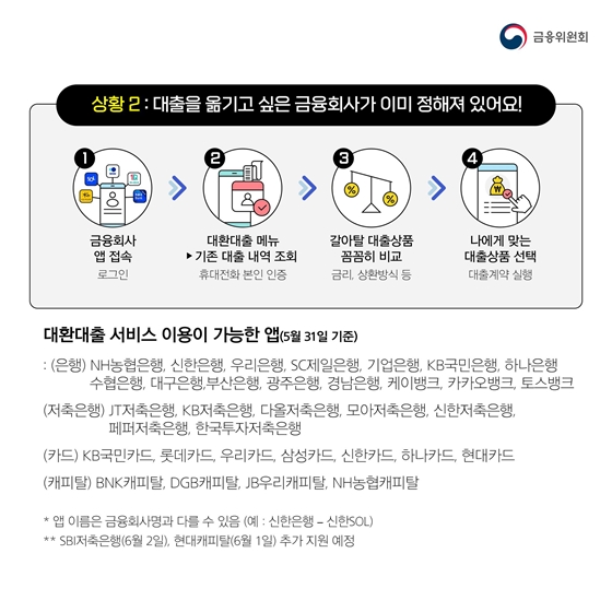 이같은 온라인·원스톱 대출 갈아타기는 스마트폰 앱(App)으로 가능하며 스마트폰에 익숙하지 않은 고령자의 경우 영업점 방문을 통해서도 가능하다.