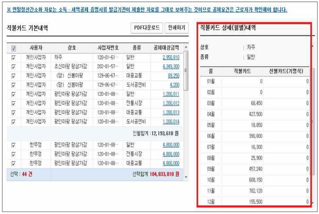 - 근무월을 선택한 경우에도 연간 지출금액을 공제받는 국민연금 보험료, 개인연금저축, 연금계좌, 소기업 소상공인 공제부금,기부금은 연간 지출 내역이 조회됨
