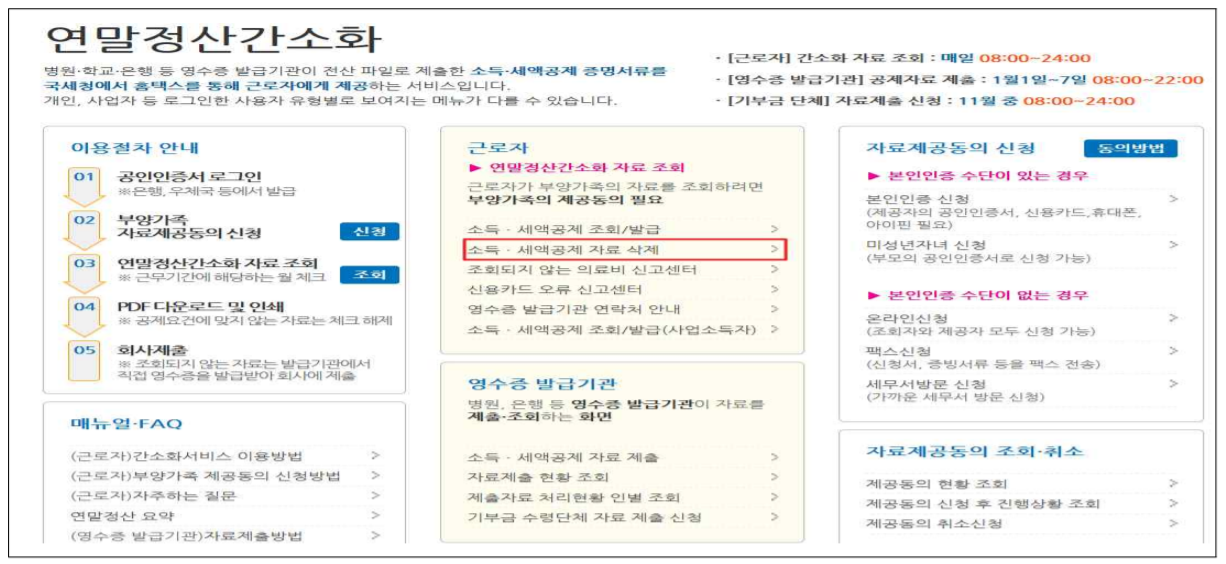▶ 연말정산간소화 서비스에서 조회 가능한 본인 자료 중 조회 되는 것을 원하지 않은 경우 삭제 신청 가능