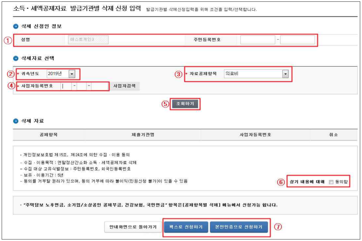 - 주민등록번호 기재후 자료공제항목 및 사업자번호를 선택하여 자료삭제를 요청 할 수 있음