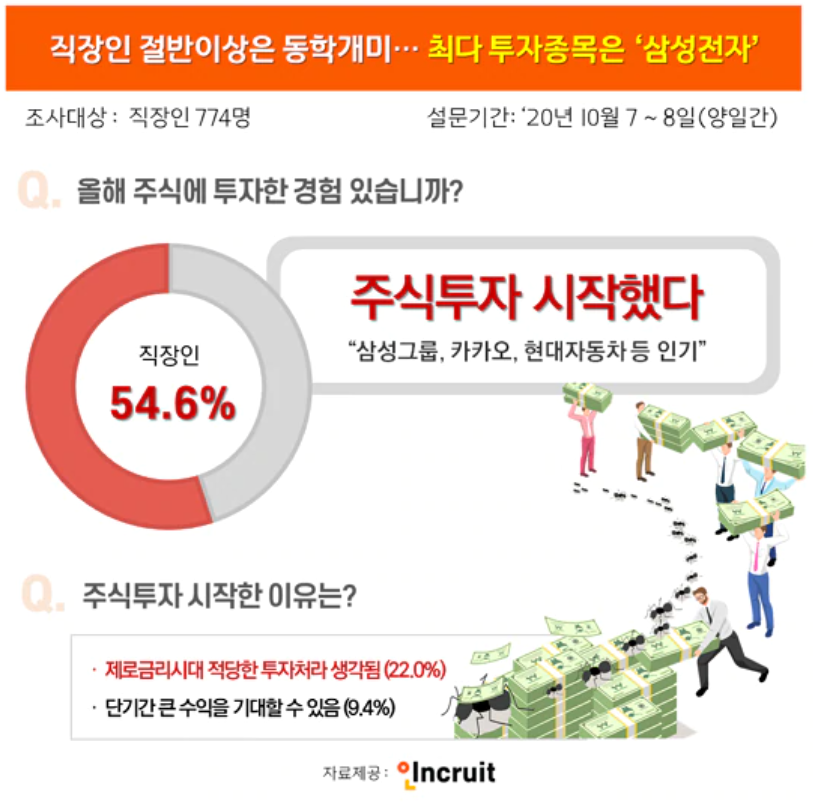 아마 주식을 시작하게 된 동기는 제로금리 시대라 더 이상 예적금이 매력적이지 않아서가 가장 큰 이유였다.그리고 재테크,투자경험을 쌓기 위해 소액투자 중이라는 직장인들이 뒤을 이었다.