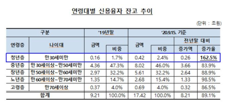 소위 동학개미로 불리는 개인투자자의 ‘빚투’(빚내서 투자) 열풍이 자료를 통해 확인됐다. 신용융자잔고는 전년보다 77.5% 가량 증가했으며 특히 청년층(만 30세 미만)의 증가율이 높았다. 특히 코로나19 수혜주로 불리는 씨젠의 신용잔고 순증가액이 최고치를 기록했다.