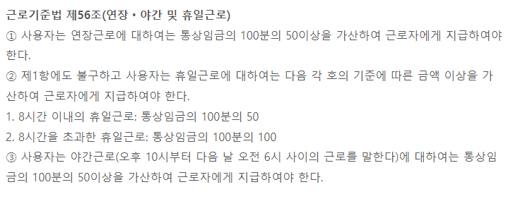 근로기준법 56조는 연장과 야간, 휴일근로에 대해 가산임금을 의무적으로 지급할 것을 명시하고 있다.