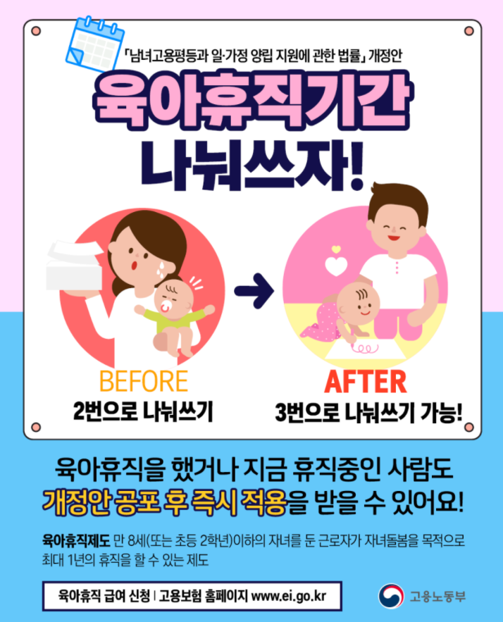 육아휴직을 했거나 지금 휴직중인 사람도 개정안 공포 후 즉시 적용을 받을 수 있어요.