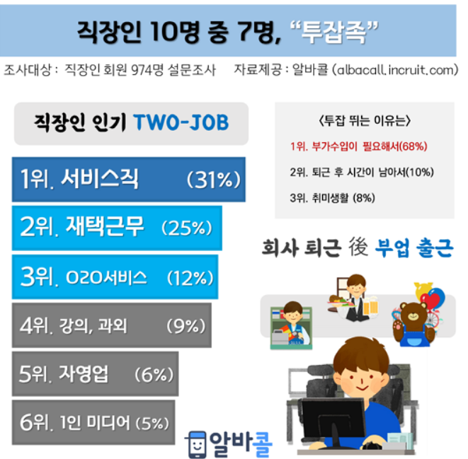"직장인 10명 중 7명꼴로는 투잡(two-job)을 경험한 것으로 확인"