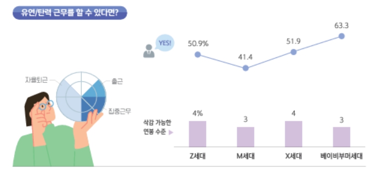 더불어 워라밸을 중시하는 젊은 세대는 시간뿐 아니라 근무지를 자유롭게 선택하는 것도 중요하게 생각했다.
