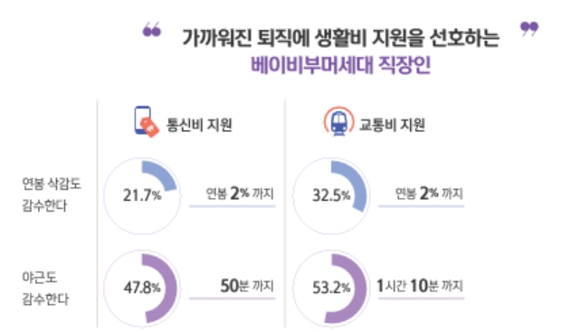 퇴직을 앞둔 베이비부머세대는 정년 보장, 장기 근속 포상 외에도실질적인 비용 절감에 도움이 되는 생활비 지원을 원했다.