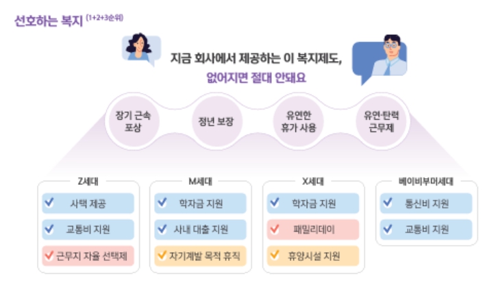 모든 세대에서 정년 보장, 장기근속 포상, 유연한 휴가 사용 등 '근무 자율성/지속성' 복지를 가장 선호했다.공통적으로 선호하는 복지 외에도 경제적 지원, 자기계발/여가 지원 등 각 세대별로 선호하는 복지는 조금씩 달랐다.
