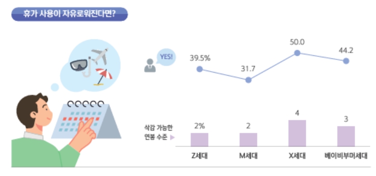 특히 정년이 다가오는 X세대와 베이비부머세대에서 정년을 보장하면 근무 시간을 연장하려는 의향이 컸다.