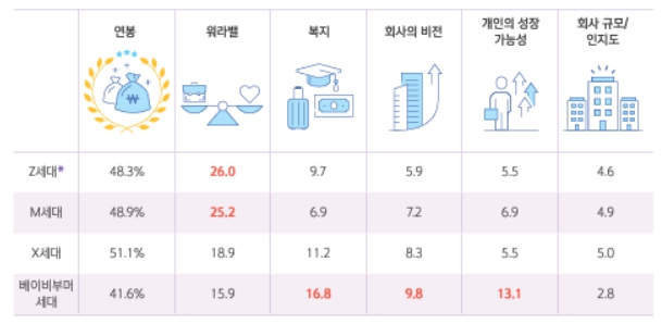 직장생활을 오래한 베이비부머세대는 복지, 개인의 성장 가능성, 회사의 비전을 다른 세대보다 더 많이 고려해 세대간 인식 차이가 존재했다.