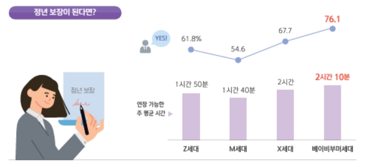 특히 정년이 다가오는 X세대와 베이비부머세대에서 정년을 보장하면 근무 시간을 연장하려는 의향이 컸다.